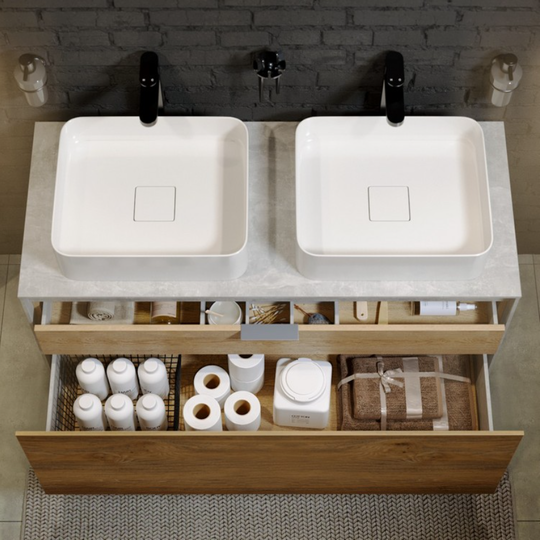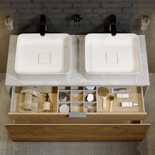Тумба Mobi 120 оснащена двумя ящиками: основным и внутренним, скрытым за фасадом. Направляющие ящиков обеспечивают плавное и мягкое закрывание. Внутренний ящик тумб укомплектован пластиковым разделителем для хранения различных мелочей. Внутренняя отделка ящиков комбинированная: боковины – цвет бетон светлый, дно – дуб балтийский. В комплект тумбы Mobi входит специальный сифон, позволяющий экономить пространство мебели. Фасады, боковины и столешницы из МДФ толщиной всего 10 мм. Подходит любой наставной умывальник. При этом умывальник может устанавливаться в любом месте, а не только центру. На данную тумбу также можно установить один умывальник. Коллекция оснащена итальянскими навесами Camar, которые выдерживают нагрузку до 200 кг.