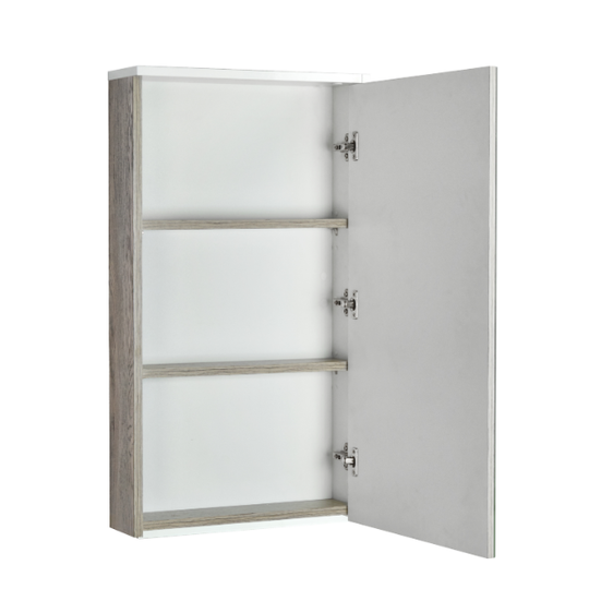 Зеркальный фасад, левая боковая стенка, а также внутренние полки зеркала-шкафа Эмма 46 выполнены из влагостойкой ЛДСП в цвете "дуб наварра". Верхняя панель и правая боковая стенка из влагостойкой ЛДСП покрашены в белый глянец. Петли с доводчиком обеспечивают плавное закрывание фасада-створки.