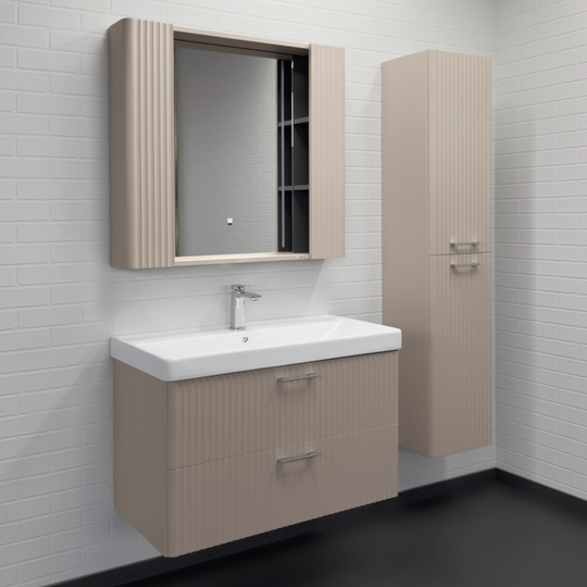 Зеркало-шкаф Comforty Ангара 90 - зеркальное высококачественное полотно с амальгамой на основе серебра. Боковые фасадные панели декорированы вертикальной фрезеровкой. За каждой из боковых панелей по две полки, доступ к которым осуществляется со стороны зеркала. В модели применяется декоративная плёнка с эффектом Soft-Touch с тиснением под текстуру дуба. Зеркало оборудовано линейной вертикальной LED подсветкой с бесконтактным включателем со встроенной функцией регулировки яркости. Температура подсветки: 6000-6500К холодная. Центральная часть задней поверхности зеркала оборудована нагревательным элементом, избавляя его от появления конденсата. Подключение к сети 220В с помощью евровилки. Длина кабеля - 950 мм.