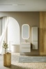 Созданная в стиле софт-минимализма, коллекция Vento отличается мягкой геометрией и визуальной тишиной. Скругленные фасады окрашены матовой краской, также они выполняют функцию скрытых ручек. Древесный корпус из ЛДСП в оттенке светлой акации. Пенал Aqwella Vento 35 оснащен двумя дверцами, комплектуется тремя стеклянными полочками.