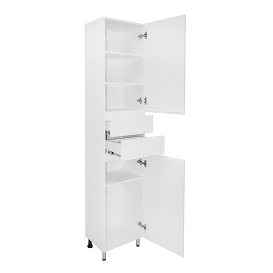 Пенал Azario Эстима 40 оснащен сверху и снизу двумя распашными дверцами на доводчиках, а посередине двумя выдвижными ящиками без доводчиков. В верхнем распашном фасаде две полочки внутри, в нижнем - одна полочка. Пенал установлен на хромированные ножки. Корпус изготовлен из ЛДСП, фасады МДФ толщиной 16 мм. Корпус и фасады производства Kronospan. Бока и фасады крашеные итальянской эмалью.