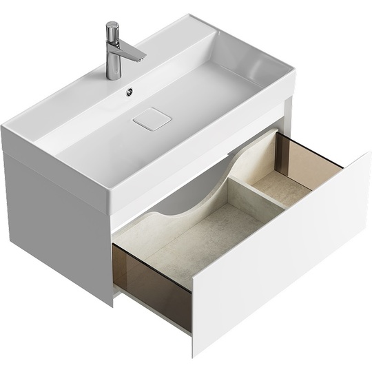Тумба Aqwella Geometria 80 оснащена одним выдвижным ящиком на направляющих скрытого монтажа, что обеспечивает плавное скольжение и мягкое закрывание. Фасады и боковины с обработкой торцов под углом 45 градусов создают лаконичность и изящный, почти монолитный силуэт в закрытом состоянии. Все грани имеют округлую фрезеровку, обеспечивая приятные тактильные ощущения при открывании. Внутри ящиков - отделка под светлый камень, боковины выполнены из толстого тонированного стекла, что добавляет коллекции элегантности.