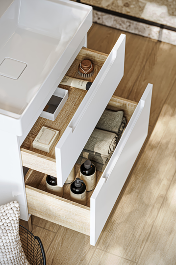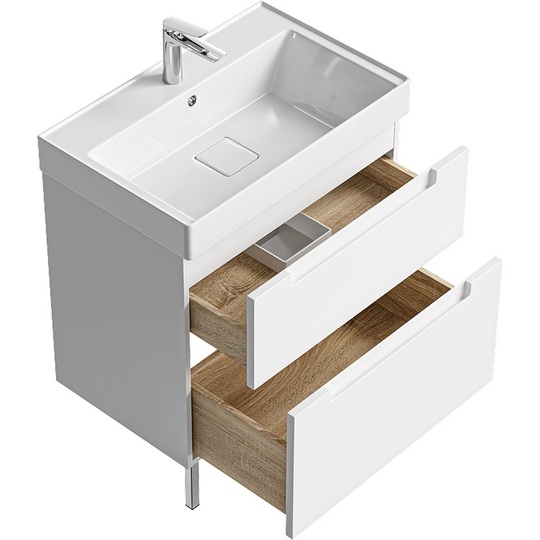 Тумба Ванкувер 70 на металлических ножках оснащена двумя ящиками с механизмами мягкого закрывания и тщательно организованным внутренним пространством с отделкой под дерево. Лаконичные фасады крашеные в белый цвет с интегрированной ручкой-зацепом подчеркивают чистоту форм и делают использование особенно удобным. Мебельный умывальник с декоративной вкладкой подчеркивает современный характер коллекции, а оптимальная глубина чаши обеспечивает комфортное ежедневное использование.