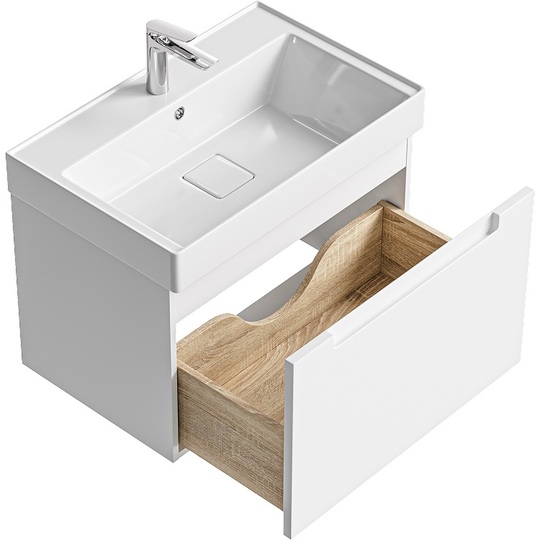Подвесная тумба Ванкувер 70 оснащена одним ящиком с механизмом мягкого закрывания и тщательно организованным внутренним пространством с отделкой под дерево. Лаконичный фасад крашеный в белый цвет с интегрированной ручкой-зацепом подчеркивают чистоту форм и делают использование особенно удобным. Мебельный умывальник с декоративной вкладкой подчеркивает современный характер коллекции, а оптимальная глубина чаши обеспечивает комфортное ежедневное использование.