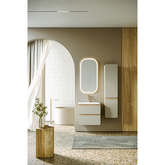 Созданная в стиле софт-минимализма, коллекция Vento отличается мягкой геометрией и визуальной тишиной. Скругленные фасады окрашены матовой краской, также они выполняют функцию скрытых ручек. Древесный корпус из ЛДСП в оттенке светлой акации. Тумбы Vento оснащены умывальниками Malaga из литьевого мрамора, сочетающими четкую геометрию с мягкой пластикой линий. Глубокая практичная чаша обеспечивает комфортность в использовании, а декоративная заглушка в сливной зоне сохраняет чистоту поверхности и архитектурную строгость. Внутреннее пространство продумано до мелочей: дно ящиков выполнено в цвет корпуса, а в верхний ящик установлена система организации внутреннего пространства в виде трех перегородок из ЛДСП.