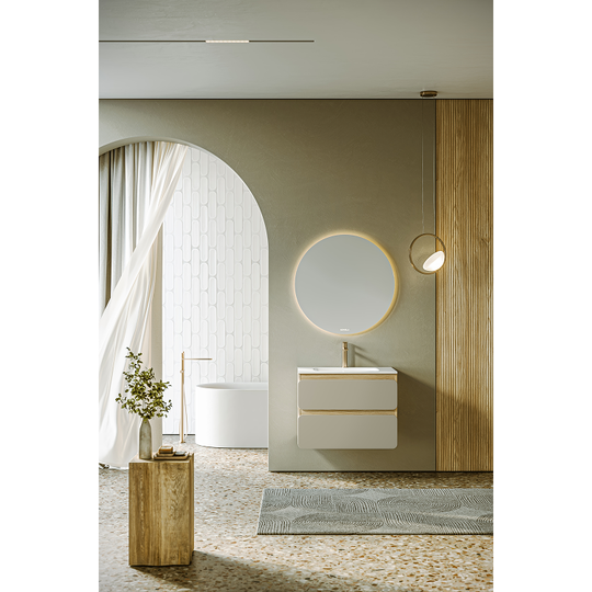 Созданная в стиле софт-минимализма, коллекция Vento отличается мягкой геометрией и визуальной тишиной. Скругленные фасады окрашены матовой краской, также они выполняют функцию скрытых ручек. Древесный корпус из ЛДСП в оттенке светлой акации. Тумбы Vento оснащены умывальниками Malaga из литьевого мрамора, сочетающими четкую геометрию с мягкой пластикой линий. Глубокая практичная чаша обеспечивает комфортность в использовании, а декоративная заглушка в сливной зоне сохраняет чистоту поверхности и архитектурную строгость. Внутреннее пространство продумано до мелочей: дно ящиков выполнено в цвет корпуса, а в верхний ящик установлена система организации внутреннего пространства в виде трех перегородок из ЛДСП.