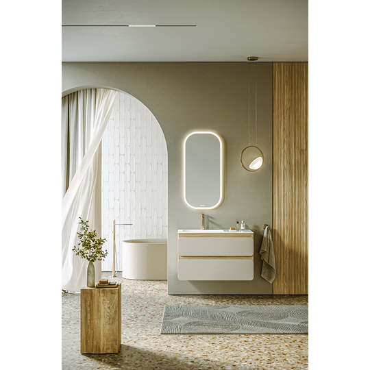 Созданная в стиле софт-минимализма, коллекция Vento отличается мягкой геометрией и визуальной тишиной. Скругленные фасады окрашены матовой краской, также они выполняют функцию скрытых ручек. Древесный корпус из ЛДСП в оттенке светлой акации. Тумбы Vento оснащены умывальниками Malaga из литьевого мрамора, сочетающими четкую геометрию с мягкой пластикой линий. Глубокая практичная чаша обеспечивает комфортность в использовании, а декоративная заглушка в сливной зоне сохраняет чистоту поверхности и архитектурную строгость. Версия тумбы 90 см с асимметричным умывальником, смещенным влево, благодаря чему все необходимое под рукой. Внутреннее пространство тумбы продумано до мелочей: дно ящиков выполнено в цвет корпуса, а в верхний ящик установлена система организации внутреннего пространства в виде трех перегородок из ЛДСП.