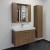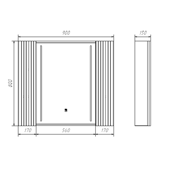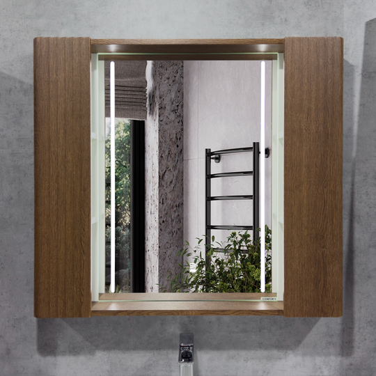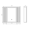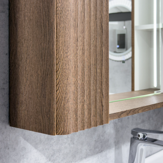 Зеркальное высококачественное полотно с амальгамой на основе серебра. Боковые фасадные панели декорированы вертикальной фрезеровкой. За каждой из боковых панелей по две полки, доступ к которым осуществляется со стороны зеркала. В модели применяется декоративная плёнка с эффектом Soft-Touch с тиснением под текстуру дуба. Зеркало оборудовано линейной вертикальной LED подсветкой с бесконтактным включателем со встроенной функцией регулировки яркости. Температура подсветки: 6000-6500К холодная. Центральная часть задней поверхности зеркала оборудована нагревательным элементом, избавляя его от появления конденсата. Подключение к сети 220В с помощью евровилки. Длина кабеля - 950 мм.