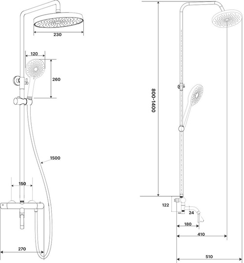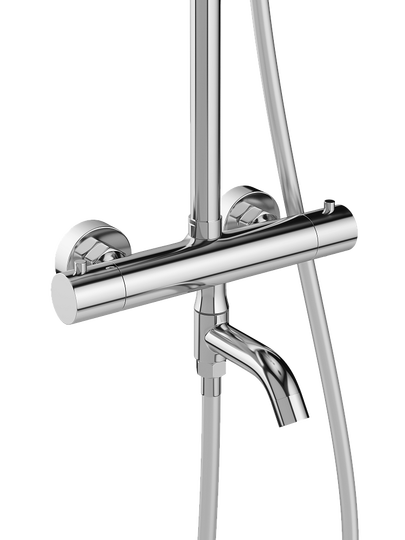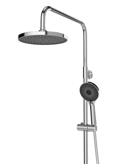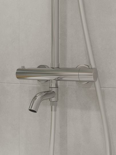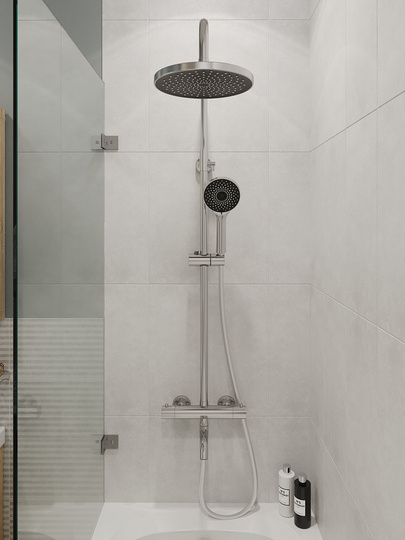 душевая стойка, верхний душ с изменяемым углом (АБС-пластик), лейка (АБС-пластик), держатель для душа, пластиковый шланг в двойной оплетке, смеситель, эксцентрик